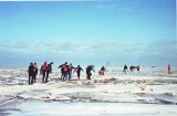 Het ijs is zeker 30 centimeter dik. Het is helder als dubbelglas. Op sommige plekken is het van een betoverende lichtgrijze tint alsof een schijnwerper het van onderen belicht. Maar er is kistwerk, ijslagen die over elkaar zijn geschoven, het hoort erbij, dit is natuurijs. Buiten de route steken de ijsschotsen soms een halve meter uit het ijs omhoog. Bij het kistwerk moeten we soms over ijsschotsen klunen. Met ware doodsverachting stuiven sommige schaatsers over het kist-werk, half struikelend passeren ze ons. Dan weer zijn er en-kele honderden meters uitmuntend ijs, waarover we kunnen blokzeilen.